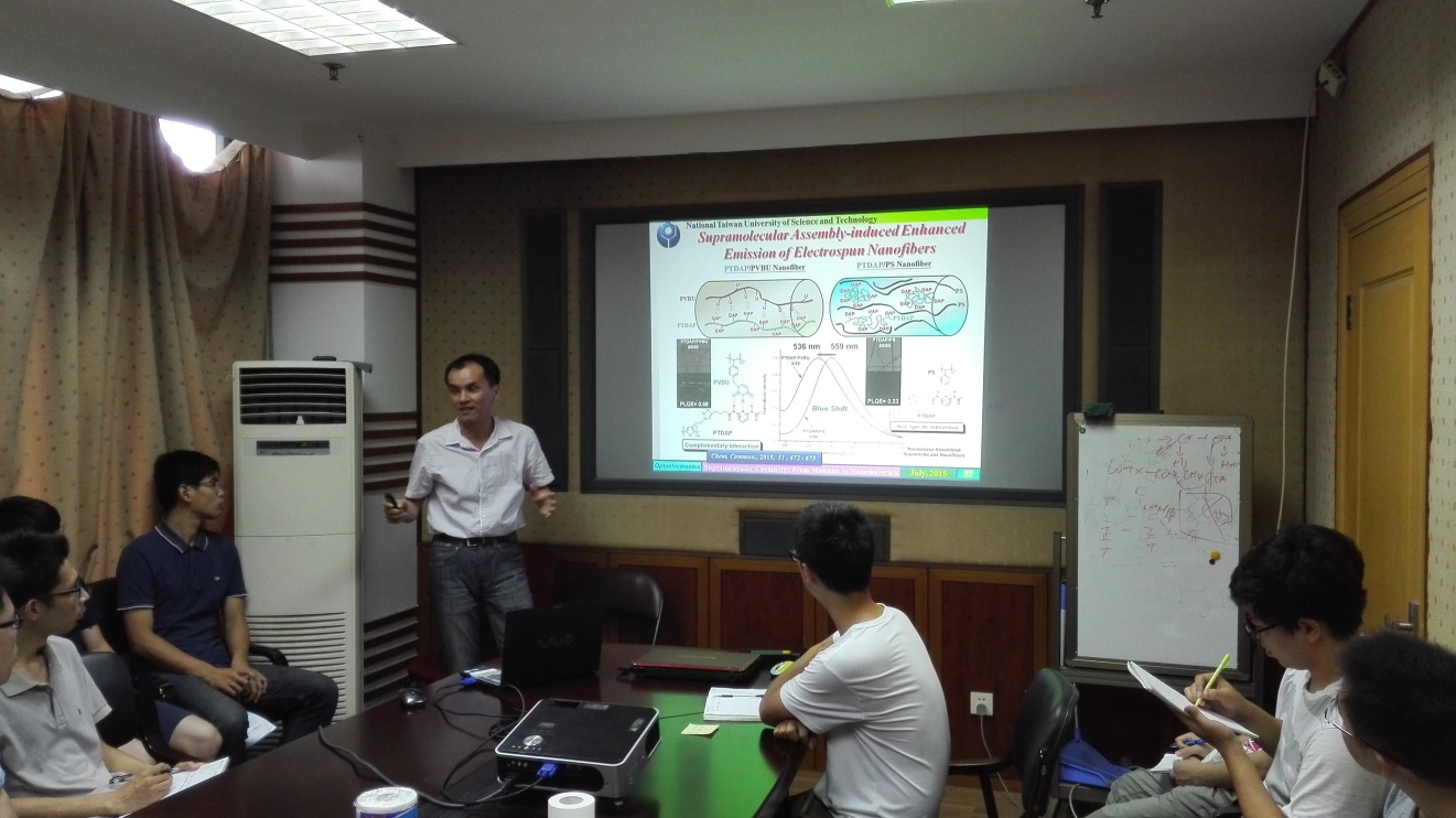 7月17日下午,台湾科技大学应用科技研究算郑智嘉博士应英国上市公司365上海市多相结构材料化学工程重点实验室(筹)邀请,作了题“Advances in Supramolecular Materials-From Precisely Self-assembled Nanostructure to Optoelectronic and Biomedical Application” 的学术讲座。