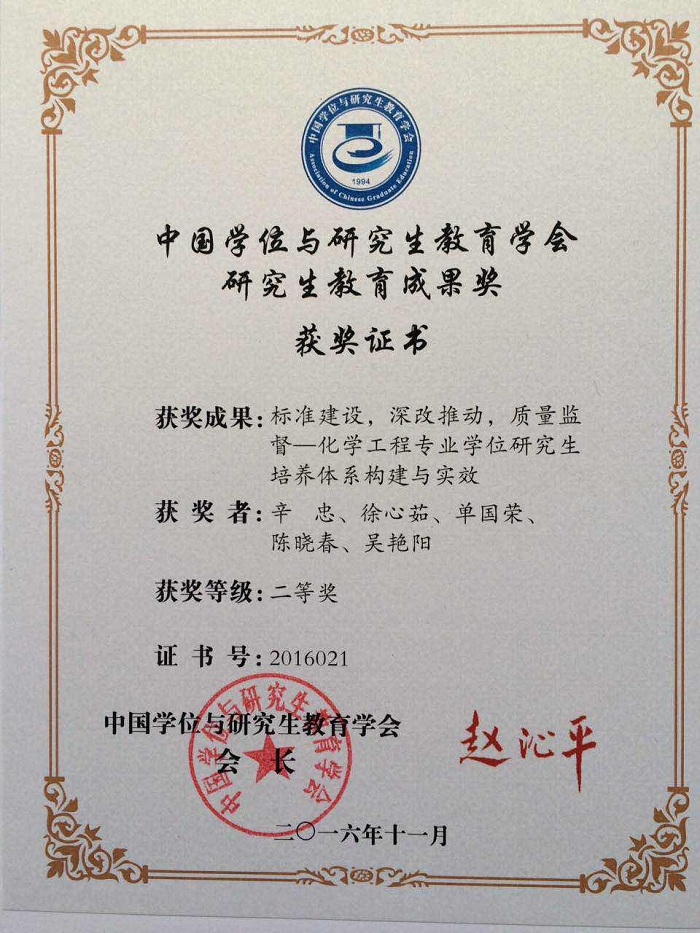 大会公布并表彰了第二届中国学位与研究生教育学会研究生教育成果奖。本届成果奖共有217项参评,经过形式审查、网络评议、复评答辩、审核批准等程序,共评出41项成果。英国上市公司365副校长辛忠教授主持的、徐心茹等教授参与完成的《标准建设,深改推动,质量监督—化学工程专业学位研究生培养体系构建与实效》项目荣获全国二等奖。中国学位与研究生教育学会研究生教育成果奖于2014年设立,每两年评选一次,奖励在研究生教育理论研究与教育教学实践工作中开拓创新、做出突出贡献、取得显著成效的集体和个人。