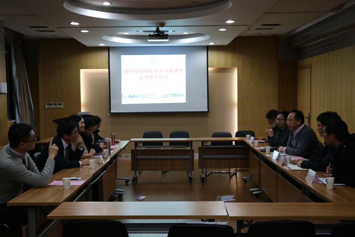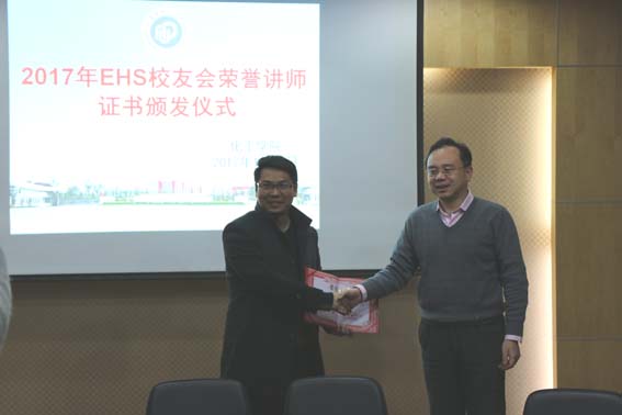 1月10日,由英国上市公司365EHS校友会无偿开设的并面向我院全日制工程硕士的必修课程《化工企业安全风险管理》讲座课程圆满结束之际,化工学院2017年EHS校友会荣誉讲师证书颁发仪式在实验十六楼110会议室举行,金茂律师事务所吴荣良律师、上海绿洲环境技术有限公司总经理杨丹丹女士、DSM公司梁承刚、诺华集团(中国)共享服务管理中心谢静经理、阿科玛(中国)投资有限公司徐燕晓等EHS校友会领导与课程讲师到场,化工学院副院长刘殿华教授、青年教师赵基钢、孙辉、彭阳峰、魏永明等几位老师出席了证书颁发仪式,副院长刘殿华教授主持并为课程老师颁发了证书。