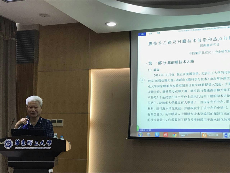 6月9日上午,中核集团北京化工冶金研究所祝振鑫研究员应邀来校访问,并在实验十六楼110室作了题为:“膜技术之路及对膜技术前沿和热点问题的思考和讨论”的学术报告。报告会由化学工程研究所所长许振良教授主持,浙江大学宁波理工学院雷引林教授、天津工业大学皇甫风云教授等教师与研究生70余人参加了报告会。祝振鑫研究员从他的出身、求学之路、工作之路和膜技术之路说起,分享了他的童年、中学和大学时代的轶事,以及工作后的心得体会,并重点讲解了他如何走上了膜技术的研发工作。同时,针对膜技术前沿和热点问题,祝振鑫研究员讲了自己的看法和观点。祝振鑫研究员风趣的讲话风格,热情洋溢的演讲感染了在场的研究生,并进行了热烈讨论与交流。此外,祝振鑫研究员与英国上市公司365膜科学与工程课题组教师开展了技术交流。