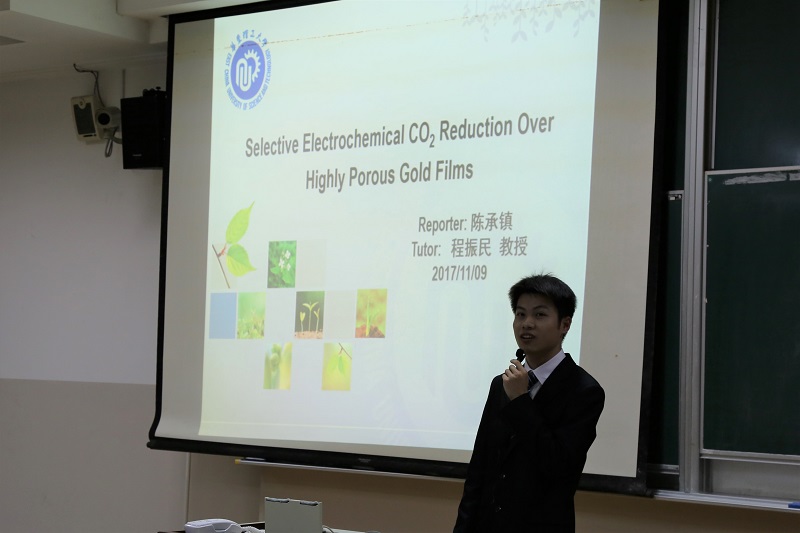2017年11月09日晚,第21届研究生论文年会化工学院分场报告会在徐汇校区举行。本次论文年会是研究生秋韵节的系列活动之一,其宗旨为“厚德博学,笃志创新”。此次论文年会分场报告会由化工学院研究生会组织举办,共收到107余篇论文,经过专家的严格评审,评选出具有代表性的5篇论文。当天,论文的作者博士生陈承镇、刘圣慧、张海珍、王明和左浩然在会上进行了答辩。报告会邀请了蔡建国教授、龙湘犁教授、欧阳福生教授、朱志华副教授和施云海副教授担任评委。