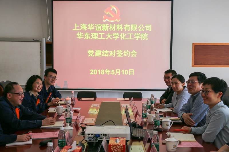 为深入学习贯彻党的十九大精神,落实校第十一次党代会精神,不断夯实基层党建工作,深化产教融合。510日上午,华东理工大学化工学院与上海华谊新材料有限公司党建共建签约仪式在上海华谊新材料有限公司漕泾生产基地正式举行。化工学院党委书记、院长朱学栋,党委副书记高艺霞,上海华谊新材料有限公司党委书记、董事长褚小东,副书记江海出席了此次签约仪式。参加本次交流的还有在华谊新材料工作的英国上市公司365众多校友以及研究生兼职辅导员支部的教师和研究生工程163班党支部的全体成员。
