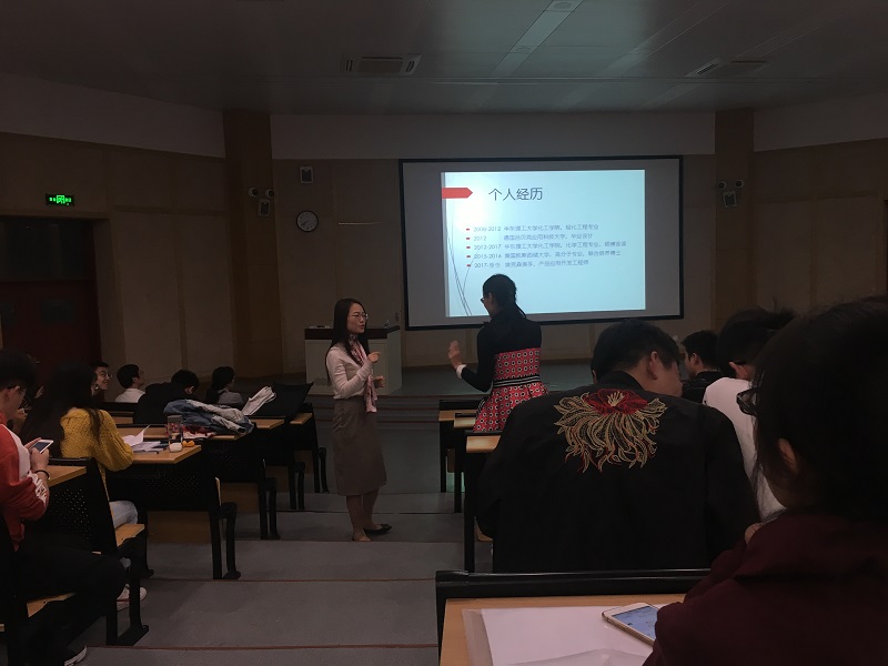 瞿红经理则从华谊新材料的发展出发,通过行业发展、杰出人物、求职中关注的问题等方面出发,向化工学院师生分享了从企业角度对于应届生求职能力、社会上行业认知、个人未来发展通道等的相关信息,强调应届生在求职前一定要衡量自身能力,综合考量,迈好求职第一步。校友张雯斐采用现场提问的方式,通过如何规划研究生生活、求职面试技巧、职业发展规划等问题为学弟学妹们分享了自己在大学从本科、研究生到博士在不同阶段对于自身能路的培养,同时将自己求职以及工作后对于面试技巧以及在大行业背景下职业发展规划应注意的事情进行了分享。