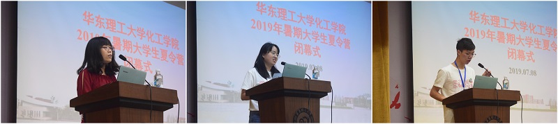 7月8日下午,夏令营闭幕式在逸夫楼报告厅举行,化工学院党委书记朱学栋、副院长方波参加了闭幕式,闭幕式由副院长刘殿华主持。朱学栋对本次夏令营做了总结,肯定了营员的各项表现,化工学院为学生提供了良好的科研和学习的平台,希望各位同学选择来华理化工学院学习。随后,班主任代表李宇璇、营员代表郑州大学钟嘉怡和中国石油大学司道润发言。李宇璇表示三天班主任工作虽然辛苦,但收获很大,相信明年这个时候,华理会变得更美、更新,希望同学们能在这美好的环境中学习、奋进;营员们感谢华理为他们作的精心准备,感谢教授们和工作人员的辛勤付出,表示这次夏令营的举办能让他们全方位、深层次、近距离的了解华理化工,更坚定了来华理读研的决心和信心,相信这是一个“不悔的选择”。闭幕式最后,所有营员和老师共同观看本次夏令营的花絮视频,分享其中的欢笑和收获。至此,华东理工大学化工学院2019年暑期大学生夏令营圆满结束。