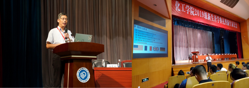 传道授业、志存高远。化工学院院长李春忠教授首先致欢迎词,对2019级新生加入化工大家庭表示热烈的欢迎。接着从对学校的历史、学院的队伍、学科建设、师资队伍等方面做了详细全面的介绍。同时,他也希望所有2019级的学生,能够笃志而行,努力进取,多读书、多交流、多思考、多实践,在化工学院开启人生新篇章。