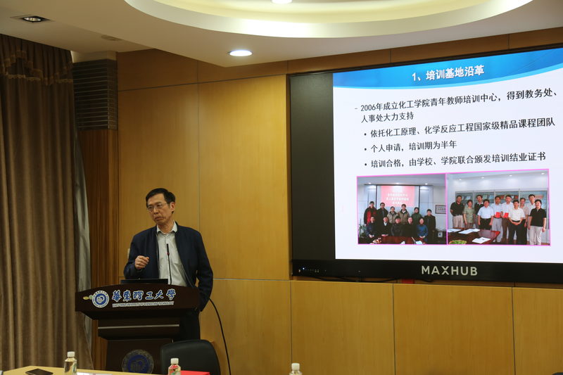 首先,基地负责人许志美介绍了化工类青年教师教学能力培训基地的历史沿革。该基地于2012年成立以来,以化工学院及资环学院的主要课程团队、实验中心及实习基地为依托,面向两个学院已培养了近60名青年教师。此外,许志美着重介绍了基地培训机制,每位青年教师在带教导师的指导下,逐一完成课程教学、实验教学、实习教学、教学论文以及工程设计能力的培训,旨在培养青年教师的教学素养和教学基本功。