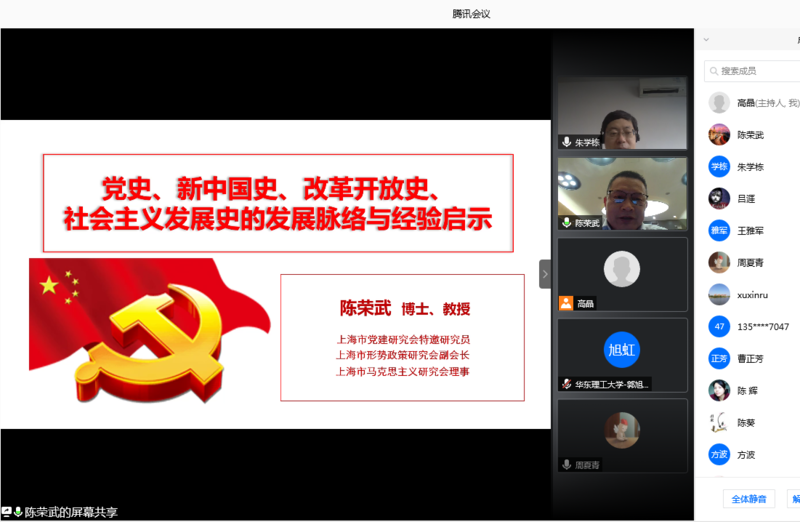 化工学院党委始终把开展“四史”学习教育作为一项重要的政治任务,为贯彻落实校党委关于加强“四史”学习教育的部署,使学院全体教职工能够充分了解我们党的光荣传统、宝贵经验和伟大成就,以史为镜、以史为师,充分汲取历史的智慧,推动学院各项事业高质量创新发展,6月23日,化工学院邀请上海市党建研究会特邀研究员、上海市形势政策研究会副会长、上海市马克思主义研究会理事陈荣武教授作题为“党史、新中国史、改革开放史、社会主义发展史的发展脉络与经验启示”的专题报告。化工学院党委书记朱学栋主持报告。学院党委副书记高艺霞,副院长方波、郭旭虹以及学院105名教职工在线参加了报告会。