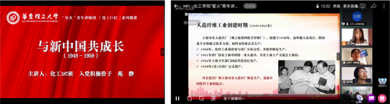 化工学院党委副书记高艺霞宣读了青年讲师团成员名单,“星火”青年讲师团正式成立。随后,化工学院18级积极分子苑静来带首场宣讲《“学四史,守初心”化工巨匠系列微课之《1949-1959与新中国共成长》,翻开新中国成立初期的历史画卷,展现了化工领域的前辈先驱勇于探索,奠定化工产业发展基石的壮丽诗篇。