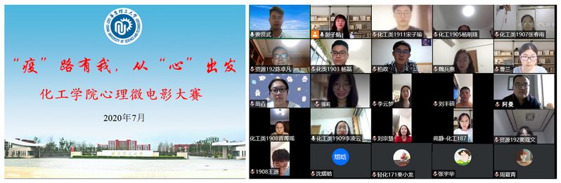 宣传心理防疫知识,提升学生心理防疫能力,充分发挥心理骨干的朋辈作用,7月13日晚,化工学院举办“‘疫’路有我,从‘心’出发”心理微电影大赛决赛。各年级辅导员、心理小家负责人、心理委员代表、新生成长营督导员观察员代表等参加了活动。