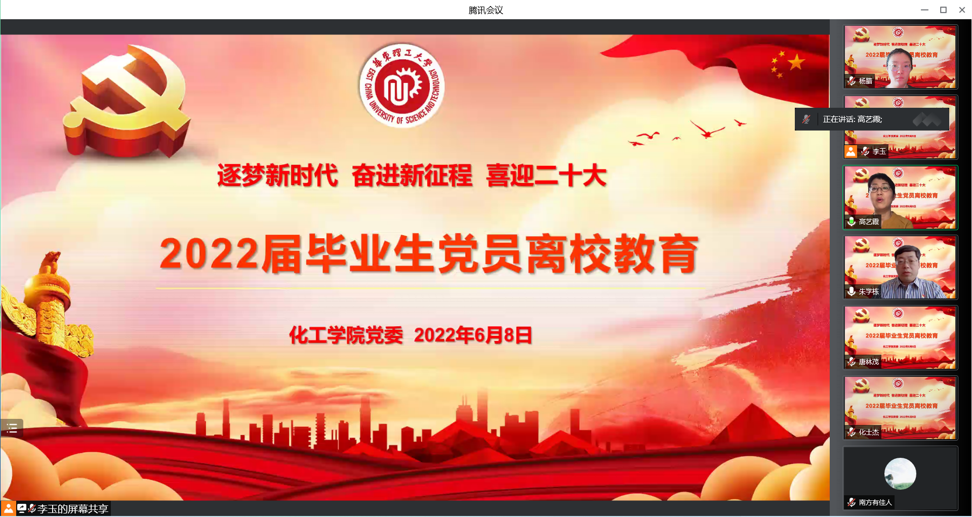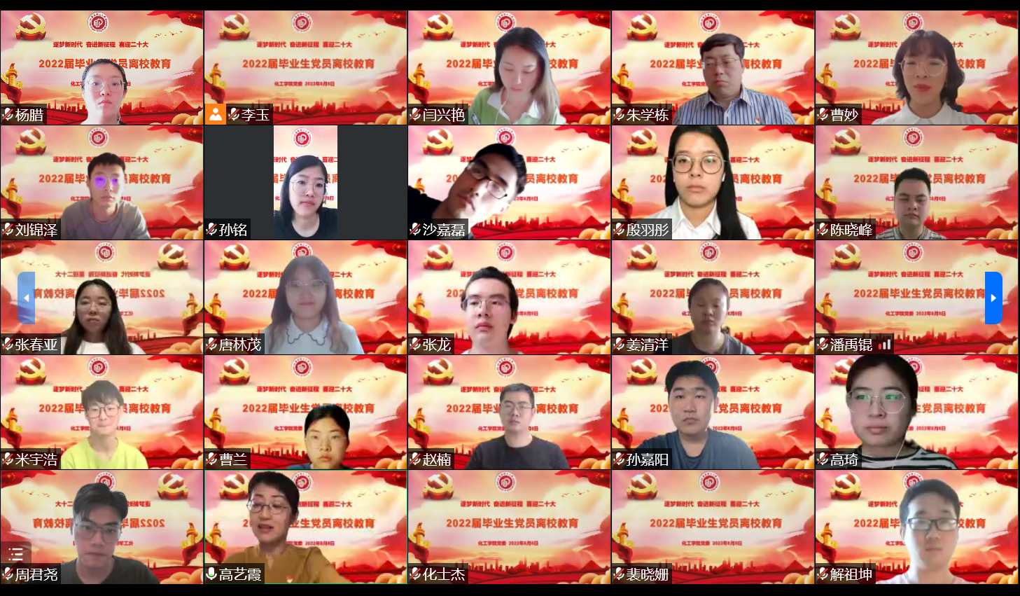 为进一步激发毕业生党员的爱国爱党爱校情怀,强化党性意识,引导广大毕业生党员坚定理想信念,满怀信心奔赴祖国各地建功立业,6月8日下午,化工学院在线开展毕业生党员离校主题教育活动。学院党委书记朱学栋、副书记高艺霞、组织员李玉、辅导员杨腊和曹妙以及全体毕业生党员参加活动。活动由高艺霞主持。