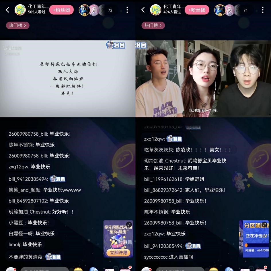 近一个半小时的毕业特辑,直播间互动不断。节目个个精彩,观看人数逾千人。观众中既有今年的毕业生,也有很多其他年级的同学。同学们纷纷表示:虽然不能像往年一样现场感受毕业晚会激动人心的氛围,但以这样一种特殊的方式表达对毕业生的祝福,仍然让大家感动满满.....