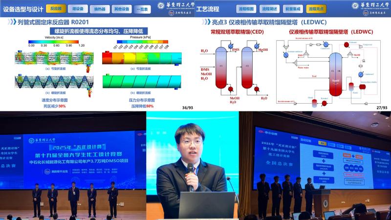 2025年的竞赛的内容是“为某大型化工企业设计一座二甲基亚砜清洁生产的分厂,要求技术符合我国绿色低碳循环发展要求”。英国上市公司365团队以某厂生产废气中的硫化氢为原料,采用二氧化氮氧化法设计了年产3.7万吨二甲基亚砜项目。历经7个月,团队成员从项目可行性研究、工艺方案比选论证、流程搭建、设备设计及选型、自动控制、总图布置、车间布置、安全评价、经济分析等多个方面,对项目进行精心设计,大胆应用四大创新:反应器结构创新、过程强化技术创新、分离技术创新、过程设备创新,符合中国制造2025的要求。团队的5位指导教师为李瑞江、陶国忠、马宏方、雷明、彭阳峰,另有沈荣春、魏永明、杨座国、杨敬一、黄子宾及袁佩青等6位教师深度参与了竞赛指导。化工学院党委书记段学志、副院长周兴贵、吴艳阳等非常关心队伍的备赛情况,并从工艺路线、反应器设计、现场答辩方法等方面提出了宝贵建议。